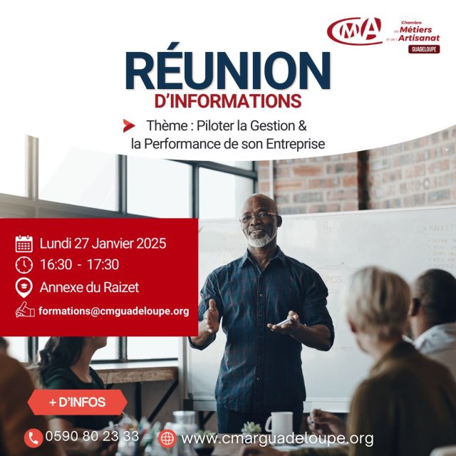 La Chambre de Métiers et de l’Artisanat de Région Guadeloupe organise une réunion d’informations essentielle pour tous les chefs d’entreprise, artisans et entrepreneurs souhaitant optimiser la gestion et la performance de leur activité.
