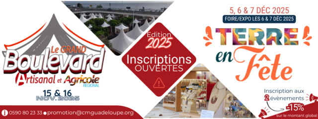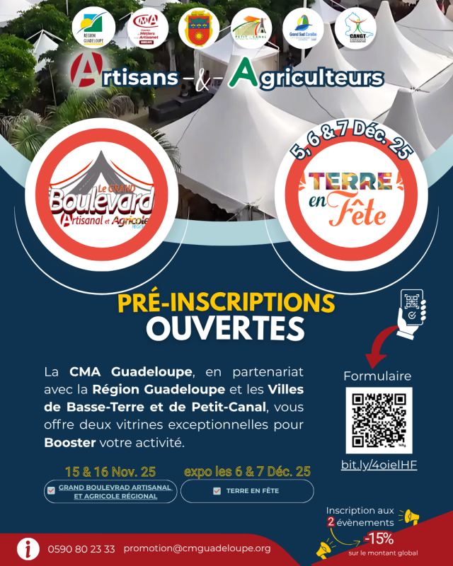 La Chambre de Métiers et de l’Artisanat de Guadeloupe, en partenariat avec la Région Guadeloupe, la Ville de Basse-Terre et la Ville de Petit-Canal, invite les artisans et les agriculteurs à participer à deux événements majeurs de valorisation du savoir-faire local.
